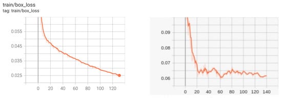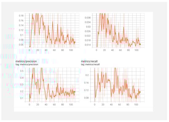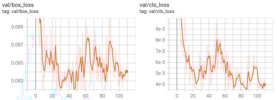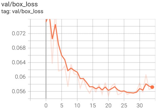Figure 25 shows that the validation loss of YOLOv5 decreased significantly until epoch 20. After that, the validation loss declined and stopped at 0.06 and 0.05, at epoch 30.