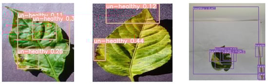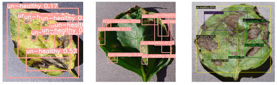 Figure 2 below depicts three of the most prevalent diseases that affect plants. Each has distinctive signs and side effects on the leaf; these can be used to differentiate and label the infections visually by the human eye and automatically by algorithms. In today’s ever-changing environment, early detection of disease and early prevention is critical to avoid issues that could otherwise arise. Figure 2 shows two types of data depicting the classes in the dataset: the first depicts an unhealthy sample while the second shows healthy sample.Therefore, the main goal was to achieve accurate detection between diseased and healthy, and a deep-learning network-based YOLOv5 model was used in this study. The described model has been useful in plant and crop plantations and agricultural production, according to experiments conducted on images with complicated backdrops. Hence, deep learning (DL) is the most accurate and precise way to identify diseases in plants with the best results. The following is a summary of this work’s significant contributions: