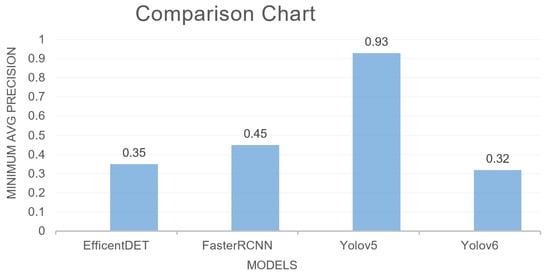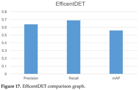 Figure 32 shows a comparative analysis between different deep-learning algorithms (EfficentDet, FasterRCNN, YOLOv5, and YOLOv6). The graph displays the mAp score that was produced by FasterRCNN, YOLOv5 (our method), EfficentDet, and YOLOv6.