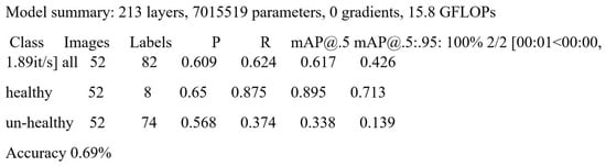 Briefly, bounding boxes are placed around the unhealthy parts, as shown in Figure 5. We then received a text file as an output after correctly labeling images. Table 3 represents the classes used in our research.