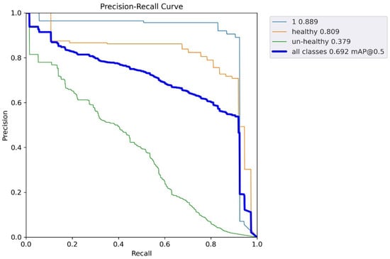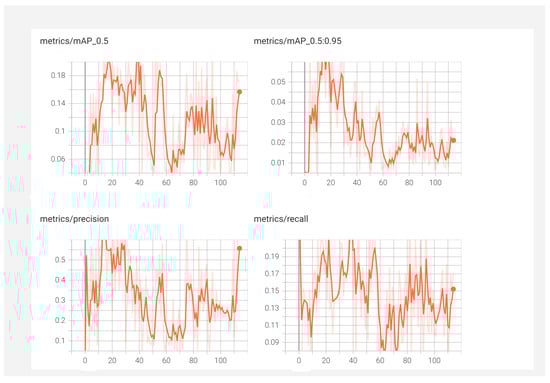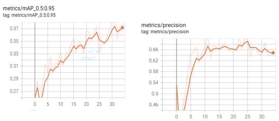 Figure 23’s graphs show the mAP at 0.5 and the mAP in the range of 0.5 to 0.95. The mAP graph was increasing incrementally with increasing epochs. The criteria for accuracy, recall, and intersection over union (IoU) were used to plot the graphs. Figure 23 depicts a precision graph that increases up to 25 epochs before fluctuating.