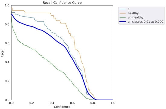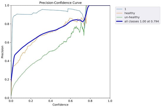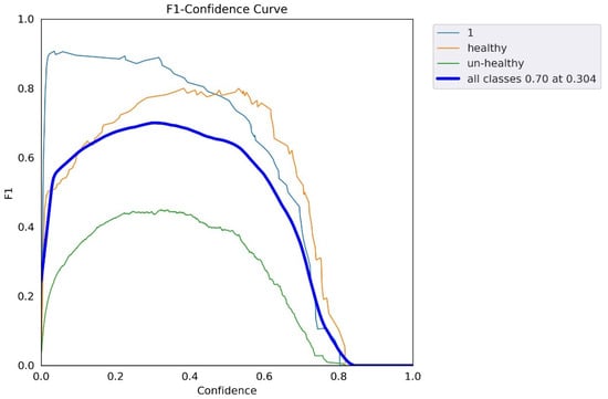 Figure 26 shows the curve that indicated the confidence via F1 score.In the insight figure, the orange line shows the healthy part of detection, and the green color shows the unhealthy part of detection. The F1 curve indicated the PPV (precision) and TPR (recall) collectively as one visualization for every threshold.