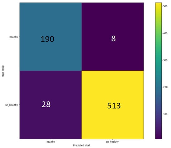 A total of 190 images were true positives in this detection. Eight images in this selection were false positives, and 28 were false negatives. Furthermore, the last 513 images identified as unhealthy were correctly identified.