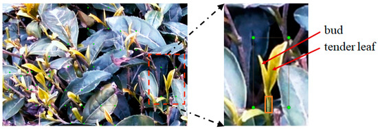 It has been reported that the optimal picking position of green tea leaves has a strong correlation with metabolism [41]. A comprehensive analysis of 18 metabolites in green tea showed that tea buds had a higher concentration of beneficial metabolites, such as gallic acid, compared to the concentration of harmful metabolites such as theanine [42]. In this study, one bud and one leaf were included in one target object, to detect such that a ground-truth-bounding box for training and evaluation of the models included one bud and one tender leaf, as shown in Figure 2. The determination of the real label sample on the ground truth is very important for the accuracy of the detection, while the results obtained by the artificial naked eye sensory method will inevitably have errors. Despite all this, the research object of this work, the tea, is a perennial plant, and the differences between new buds and old leaves are obvious, especially in color and shape (Figure 2). Moreover, in this paper, a unique combination of one bud and one leaf is selected as the identification standard, which makes the label data more targeted. Besides, the automatic picking of tea is still developing, thus there is no very mature standard. This work is also a preliminary one, further work will be conducted in the near future. The optimal picking areas were also covered as the area of the yellow rectangular box. LabelImg was the labeling tool used to make the ground-truth-bounding boxes in the images.