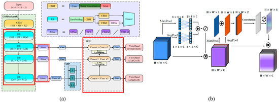 Figure 3a shows the basic structure of the improved tea buds detection algorithm model proposed in this paper. We chose an image of pixels as the model input. Through the CBM module, the shallow feature information was aggregated. Then, through the four-layer RB structure, further features were extracted, and three effective feature layers were obtained, where the first two focused on the detection of small- and medium-sized tea buds, and the last one focused on large-scale features. Then, the different attention mechanism modules were introduced. The specific processes are shown in Figure 3b. The last layer used the SPP structure to enlarge the receptive field, and FPN to realize the features’ fusion. Finally, we obtained the features with dimensions of , , and (where 18 is : 3 is the number of anchors, 1 is the number of categories, 1 is the confidence level, and 4 is the coordinate information of the object).