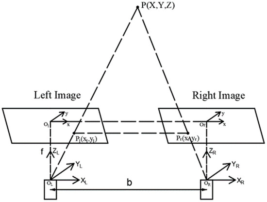 Therefore, it is known that the points of P in the left and right images of the binocular camera are Pl (xl, yl) and Pr (xr, yr). The three-dimensional coordinates of P in the OL-XLYLZL coordinate system can be obtained as shown in Equation (1), where Z is the depth value of point P.