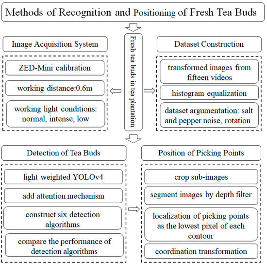 The sub-objectives of the paper are: (1) to study a solution to detect tea buds growing in outdoor natural light using a stereo vision (RGB-D) camera, (2) to characterize the performance of the stereo camera, (3) to develop a lightweight YOLOv4, with improved detection accuracy, (4) to apply 3D depth information to improve the detection accuracy of tea buds, (5) finally to solve the problem of locating picking points.