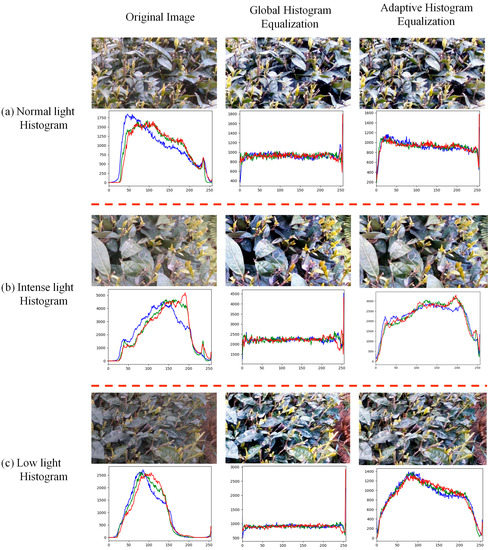 The RGB color images acquired under the different light conditions (normal: 9–10 a.m., strong: 12–1 p.m., low: 5–6 p.m.) showed different contrast and histograms before and after equalizing the histograms via global and locally adaptive methods, as shown in Figure 7. The images under the normal lighting condition, taken between 9 and 10 a.m., showed overexposure in the bright leaf areas after histogram equalization. Thus, the normal lighting images were assigned to the dataset without changing the intensities through any histogram equalization. The intensity histogram of images taken under the intense light condition, between 12 and 1 p.m., showed overexposure in the highlighted areas, as expected. Adaptive histogram equalization (AHE) performed better in revealing the lost detail in the highlighted areas, compared with global histogram equalization (GHE). Hence, the images taken under the intense light condition were preprocessed with AHE. On the other hand, because the images taken under the low light condition suffered from a loss of detail in the shadowed (or dark) areas, contrast enhancement help to reveal the lost detail. Similar to the intense light condition case, the AHE performed better than GHE in enhancing the contrast, while minimizing the loss of detail in all intensities. Thus, the low-light images were preprocessed with AHE. All image data, corrected for the light effect, were further augmented by unsharp masking for image sharpening, median filtering for removal of salt and pepper noise, and rotation. These preprocessed images were used for training the tea bud detection models.