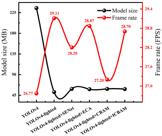 The lightweight network YOLOv4-lighted, was combined with the attention mechanism SENet, ECA, CBAM, and ICBAM modules, to make five improved YOLOv4 networks, as shown in Table 2 Compared with the baseline YOLOv4, the total number of parameters of the YOLOv4-lighted network was reduced by 79.40%. In addition, compared with the YOLOv4-lighted network, the networks with different attention mechanisms had an increase of less than 1.31% in the total number of parameters. Although the total amount of the five improved network parameters was basically the same, the model detection effect needed to be further compared.