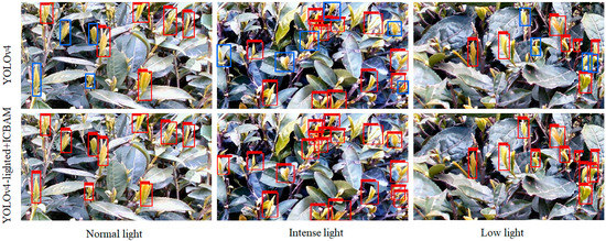 Figure 11 shows the target detection results of the YOLOv4-lighted + ICBAM (best) and the YOLOv4 (baseline) models on the test dataset, where the blue boxes are the missed tea buds. Qualitatively, the detection performance of the YOLOv4-lighted + ICBAM model was better than that of YOLOv4, that missed small-sized tea buds or ones in densely populated areas. The attention mechanism used in the improved network models resulted in better sensitivity for the detection of tea buds in areas of densely populated tea leaves, and the use of multiscale feature layers enabled the detection of small tea buds. In addition, the adaptive histogram equalization made the target detection relatively robust to the effect of different lighting conditions.