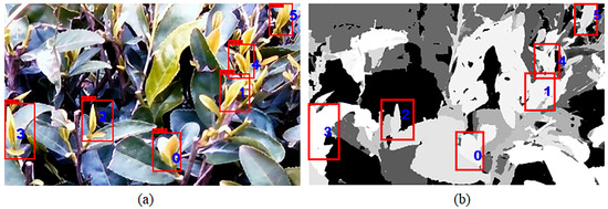 Note that an RGB color image, and its corresponding depth image, were obtained with a stereo vision camera, such that both images were matched spatially in pixel coordinates. The detection process of picking points started with the RGB images, where tea buds were detected and localized by bounding boxes with the YOLOv4-lighted + ICBAM model, as shown in Figure 12a. Because the color image and its corresponding depth image were spatially registered, the same bounding boxes found over the color image could be applied to the depth image without modification, as in Figure 12b.