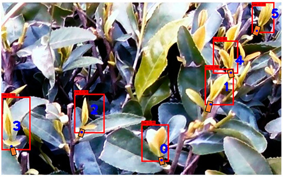 It was trivial to locate the coordinates of the detected picking points in the original RGB image (Figure 14) because the coordinates of the sub-images originated from the original image. The accuracy of the detected points’ coordinates for picking tea buds was evaluated with the ground truth picking areas (not single points), that were manually determined in each RGB image by a human expert. Figure 14 shows the optimal picking areas denoted as orange rectangular boxes. The evaluation metric was as follows: (1) If a detected picking point fell in its optimal picking area, the positioning was successful, with a score of 1; (2) otherwise, it was a failed positioning, with a score of 0. Table 5 shows the results of the picking point positioning test. The positioning success rate was the proportion of the number of correctly positioned picking points within the targeted picking areas among the correctly identified tea bud objects. The average success rate, and time for picking point positioning, were 87.10% and 0.12 s, respectively. The results showed that the tea bud detection method proposed in this paper, and the localization of the picking points, would be feasible in practice, when the output would be combined with a picking machine. When a tea bud was obstructed by objects in the foreground, it could not be identified and the depth filter was used. If the foreground obstruction was other tea buds, the obstructed tea buds would be detected in the next detection, when the tea buds in the front had been picked.