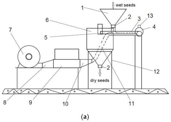 In order to preserve harvested agricultural seeds with a higher moisture content, they must be dried to reduce the moisture content to below 14% [1,2]. Convective drying is currently the most widely used method for dehydrating seeds. Keeping the seeds at a high temperature for a long time reduces the efficiency of drying by obtaining an unsatisfactory quality of dried seeds [3,4,5]. In order to improve the heat transfer efficiency, to reduce the drying time, and to keep the quality of drying seeds and other foods, several innovative technologies in heating and drying have been developed [6,7,8,9]. The hybrid drying technology, where, in addition to convective drying, microwave drying is also integrated, is considered part of the fourth-generation of technologies [9,10].