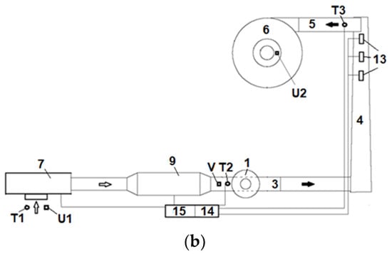 The hybrid dryer: (a) side view, (b) top view; 1. Wet seed hopper; 2. Lock; 3. Tangential pipeline inlet seeds; 4. Hybrid truncated cone dryer; 5. Tangential pipeline outlet seeds; 6. Cyclone; 7. Fan; 8, 10. Link pieces; 9. Air heating battery; 11. Warm air pipe; 12. Support brackets; 13. Antennas; 14. Temperature monitoring; 15. Energy monitoring; T1. Air temperature sensor, T2. Input air temperature sensor; T3. Output air temperature sensor; U1. Input air humidity sensor; U2. Output air humidity sensor; V. Air velocity sensor.