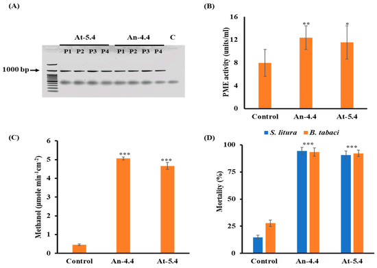 Molecular analysis of T4 generation transgenics. (A) Gel image showing cDNA PCR from At-5.4, An-4.4, and control. Arrow indicates band corresponding to atpme and anpme from four independent plants (P1-P4) of both transgenic lines. Graph showing (B) PME activity, (C) quantification of methanol emission in transpirated water through the stomata on leaves surface, in both transgenics and control plants. (D) Mortality of S. litura and whiteflies on At-5.4, An-4.4, and control plants after 6 days. * p < 0.05; ** p < 0.01; *** p < 0.001.