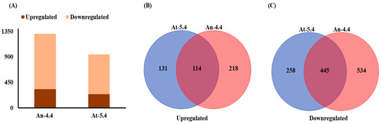 Microarray analysis of transgenic plants. (A) Number of significantly up and down regulated genes in An-4.4 and At-5.4; number of commonly up- (B) and downregulated (C) genes between An-4.4 and At-5.4.