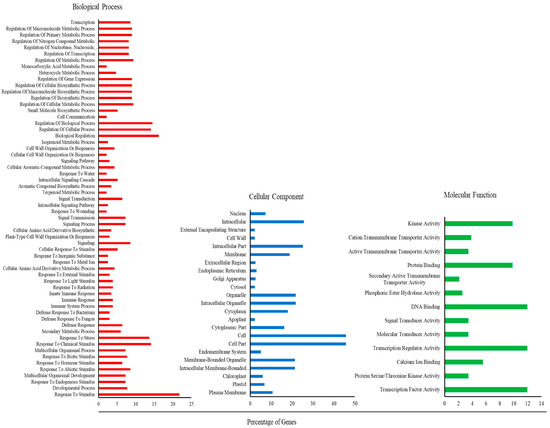 The success of the plant response on signal perception depends on the regulatory network that connects to the downstream response [1]. Global analysis of gene expression profiles can improve our overall knowledge of the molecular basis of the plant response. Therefore, Microarray analysis was performed to understand transcriptional changes in both types of high methanol-producing transgenic lines. A Total of 1311 and 951 genes were found differentially expressed (2-fold or greater change at p value < 0.05) in the transgenics of An-4.4 and At-5.4, respectively (Figure 2A, Supplementary Datasets S1 and S2). An-4.4 transgenic lines had a greater number of differentially expressed genes than At-5.4. This might be due to their interkingdom origin. Out of these, 332 and 979 genes were upregulated and downregulated in An-4.4 transgenics, whereas 245 and 703 were upregulated and downregulated in At-5.4 transgenics over the control (Figure 2A). This was consistent with previous findings where wounding and direct methanol spraying in plants showed alteration in gene expression [16,20]. We explored common genes in both transgenic lines and, interestingly, 114 and 445 genes were commonly up- and downregulated in both types of transgenics, respectively (Figure 2B,C). These commonly shared differentially expressed genes were further annotated by Gene Ontology (GO) on agriGO under biological process, cellular component, and molecular function categories. Total 96 GO terms were significantly (p value < 0.05) identified for all differentially expressed gene (Supplementary Dataset S3). Among them, the cell (GO:0005623) and cell parts (GO:0044464); transcription factor (GO:0003700) and regulator activity (GO:0030528); and response to stimulus (GO:0050896) were highest in their respective categories (Figure 3). It is plausible to have changes in cell and cell part categories because PME is a cell wall re-modelling enzyme which was overexpressed to develop these transgenic lines [5,6]. We also recorded responses to stimulus GO, as these transgenic plants have high rates of methanol emission, which has a major role in biotic interactions [13,20]. As many genes were differentially expressed in both transgenic lines, this may be due to changes in the expression of transcription factors.