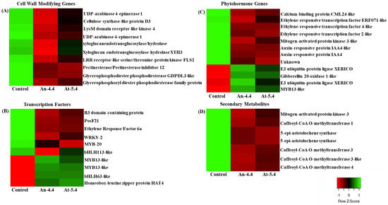 Expression analysis of cell-wall-related genes (A), transcription factors (B), phytohormone signaling genes (C), and secondary metabolite pathway genes (D) in control as well as in both (An-4.4 and At-5.4) transgenic lines.