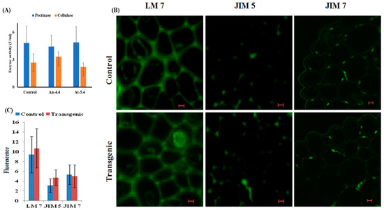 Biochemical characterization of cell wall. (A) Graph showing average values (n = 6) of pectinase and cellulase enzyme activity in control and both transgenic lines (An-4.4 and At-5.4). (B) Representative confocal images showing transverse section of transgenic (An-4.4) and control leaves at 40× magnification. Leaf sections were stained with fluorescence labelled pectin specific monoclonal antibodies (LM 7, JIM 5, JIM 7). (C) Graph representing average fluorescence values (n = 5) in the transgenic (An-4.4) and control leaves.