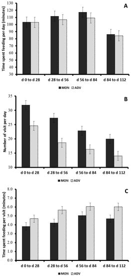 p = 0.27) during the first experimental period (d 0–28), which involved the adaptation of the animals to a high concentrate diet. In this context, post-adaptation intake (d 29–112) was 12.2% higher in animals receiving ADV. The behavior of supplement intake in terms of time spent feeding per day, number of visits per day to the feeder, and time spent feeding per visit are shown in