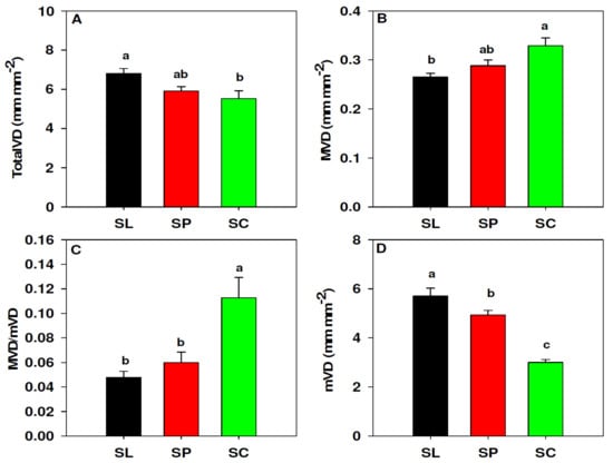 Differences in leaf venation between S. lycopersicum (black, SL), S. peruvianum (red, SP) and S. chilense (green, SC). Total vein density, TotalVD (A), major vein density, MVD (B), ratio of MVD to mVD, MVD/mVD (C), minor vein density, mVD (D). Values in (A,B,D) represent the mean and the error bars represent standard error. Values in (C) represent the median analyzed by Kruskal–Wallis analysis and error bars represent the 75% percentile. Different letters indicate significant differences (p < 0.05) according to Fisher (A,B,D) and Dunn’s (C) tests.
