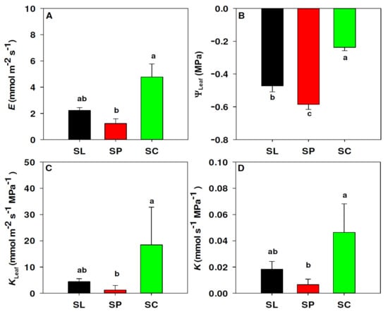 Differences in leaf hydraulics between S. lycopersicum (black, SL), S. peruvianum (red, SP) and S. chilense (green, SC). Water flux E (A), water potential ΨLeaf (B), area-adjusted leaf hydraulic conductance KLeaf (C) and total leaf hydraulic conductance K (D). Values in (A,C,D) represent the median and 75% percentile. Values in (B) represent the mean and standard error. Different letters represent significant differences (p < 0.05) according to Fisher (B) and Dunn’s (A,C,D) tests.