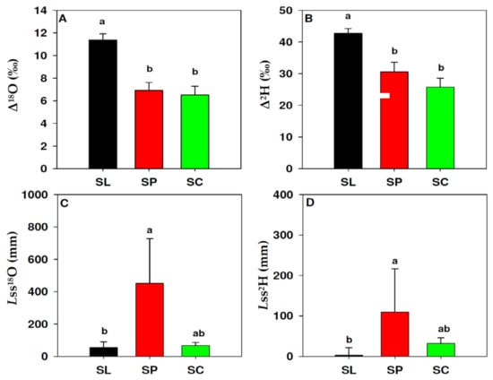 Leaf water enrichment traits in S. lycopersicum (black, SL), S. peruvianum (red, SP) and S. chilense (green, SC). Δ18O and Δ2H, oxygen (A) and hydrogen (B) leaf water isotopic enrichment; Lss18O and Lss 2H, effective path length, calculated from Δ18O and Δ2H. Values in (A,B) represent the mean and standard error. Values in (C,D) represent the median and 75% percentile. Letters indicate significant differences (p < 0.05) according to Fisher (A,B) and Dunn’s (C,D) tests.
