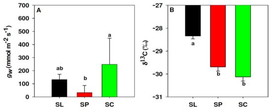 Differences in leaf conductance to water vapour, gw (A) and leaf isotope composition of 13C, δ13C (B) between S. lycopersicum (black, SL), S. peruvianum (red, SP) and S. chilense (green, SC). Values in (A) represent the median and 75% percentile. Values in (B) represent the mean and standard error. Letters indicate significant differences (p < 0.05) according to Fisher (B) and Dunn’s (A) tests.