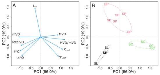 Principal component analysis (PCA) for leaf hydraulics, isotopes and venation variables among the three species here studied. The variable loading plot (A) shows the variables as blue arrows: ΨLeaf, leaf water potential; KLeaf, leaf hydraulic conductance; MVD, mVD and MVD/mVD, major, minor vein density and major/minor vein ratio; Lss, mean effective path length; δ13C, leaf carbon isotope composition; Δ18O, isotopic enrichment of leaf water. The scores plot (B) shows the score of each replicate along the PCA axis, indicating the species grouping: S. lycopersicum (SL), S. peruvianum (SP) and S. chilense (SC) and their respective ellipsoid hulls.