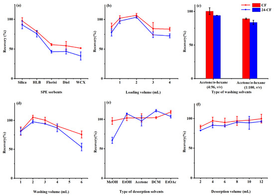 Owing to the vital role of sorbent during the SPE procedure, different types of SPE sorbents were collected and tested to compare the enrichment efficiency. HLB sorbents are hydrophilic–lipophilic-balanced, water-wettable, reversed-phase sorbents and are synthesized from two monomers, namely N-vinylypyrrolidone and the lipophilic divinybenzene. These sorbents have unique reversed-phase capacity with a neutral polar hook to enhance the retention of analytes. WCX sorbents are mixed-mode sorbents with ion-exchange and reversed-phase capacity. These sorbents can be used for all types of basic analytes. Florisi sorbents are used to extract pesticide residues and are highly polar, highly active porous adsorbents that can adsorb target compounds of low and medium polarity, such as organic pesticides containing chlorine, nitrogen and phosphorus. Diol sorbents are prepared by the silica-based polar phase with neutral properties and comprise another type of silica in routine applications, especially when the analyte is undesirable or requires a weak interacting phase. ProElut silica sorbents consist of unbonded silica gel with high polarity which can retain most of the analytes with acidic properties. As presented in Figure 1a, the results indicated that the recoveries of ProElut silica sorbents were 97.26% and 90.58% for CF and 24-CF, and the recoveries of HLB, WCX, Florisi and Diol were all less than 80% for all target compounds. Therefore, silica sorbents were selected as the SPE sorbents in the following study.