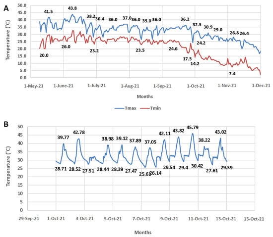 The figure illustrates the ambient temperature (A) and high temperature (HT)maintained during the course of experiment (B). Each data point represents the average of three replications.