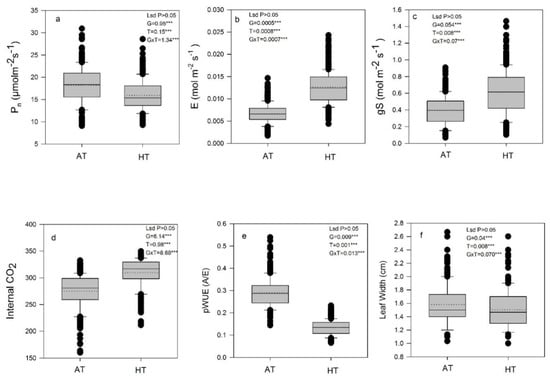 The box plot illustrates the phenotypic plasticity of (a) photosynthetic rate (Pn), (b) transpiration rate (E), (c) stomatal conductance (gs), (d) substomatal CO2 concentration (Ci), (e) photosynthetic water use efficiency (pWUE) and (f) Leaf width in rice accessions under both ambient-temperature (AT) and high-temperature (HT) conditions in experiment 1. The box plot represents the median values (n = 3) for each trait of the 73 rice accessions. The black solid and dotted lines indicate the median and mean of all the rice accessions used in the study, respectively. Significance values were calculated and represented as p < 0.001 denoted by ***. Results that were not statistically significant are indicated as ns. Outliers are represented by closed circles.