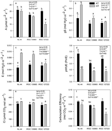 A significant G × T (p < 0.05) effect was recorded for Pn and other gas exchange traits in two contrasting rice accessions and the check NL-44 (Figure 4a–f). Pn showed a significant reduction (p < 0.05) under HT in the sensitive accession IRGC 127222. This accession showed higher Pn than the tolerant accession, IRGC 135883, under AT conditions, but under HT stress, it showed an almost 50% reduction, while IRGC 135883 showed only a marginal reduction of 7%. These changes in Pn were comparable to NL-44 (Figure 4a). HT treatment showed a significant genotypic (p < 0.05) effect for stomatal conductance (gs) (Figure 4b). The differences in gs were not significant between the contrasting accessions under AT conditions, but under HT conditions, they increased by 41% and 9% in both IRGC 135883 and IRGC127222 accessions, respectively. On the other hand, NL-44 showed the highest increase (70%) in gs under HT conditions. Similarly, a significant genotypic (p < 0.01) treatment (p < 0.001) and genotype × treatment (p < 0.01) effect were recorded for E and increased significantly (60%) under HT in the tolerant accession IRGC 135883 as well as in the check NL-44 (Figure 4c). In contrast, the increase in E in the sensitive accession, IRGC 127222, was relatively marginal when exposed to HT. Under AT treatment, the level of E was almost similar, in both the rice accessions and check.