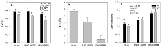 Under HT conditions, a significant decrease in flag leaf Fv/Fm was observed, and the rate of reduction was highest in sensitive accession IRGC127222 (21%), followed by a 14% reduction in IRGC 135883 and 9% in NL-44. The level of Fv/Fm under HT conditions was almost similar in accession IRGC 135883 and check (NL-44) (Figure 5a). The highest TTD was recorded under HT in check NL-44 (4.68 °C), followed by IRGC 135883 (3.08 °C) and IRGC 127222 at (0.48 °C) (Figure 5b). For leaf width, there was no significant difference between the treatment and accessions (Figure 5c).