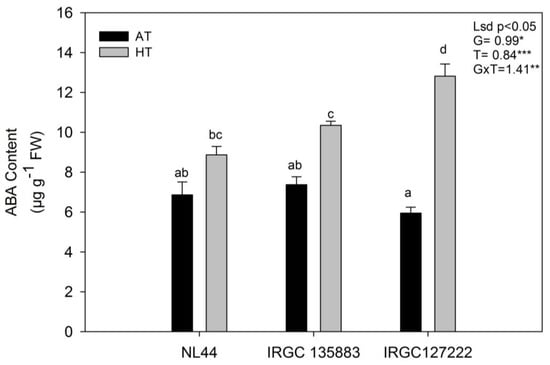 The effect of ambient-temperature (AT) and high-temperature (HT) exposure on abscisic acid (ABA) content of contrasting rice accessions at the reproductive stage. Means of three replicates are indicated by the vertical columns in the figure. Error bars indicate the ± SEM. The least significant difference test was used to determine significance. Means with the different letters are significantly different at level: * p < 0.05,** p < 0.01, *** p < 0.001.