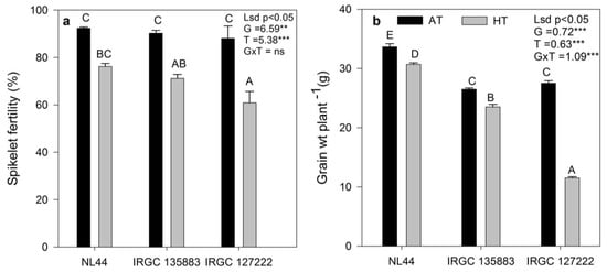 For each accession, three plants were selected per treatment and measurements were taken for the following traits: grain weight per plant and spikelet fertility. Filled and unfilled grains were manually separated from the main culm and used for calculating the spikelet fertility percentage (filled grains/(filled + unfilled grains) × 100%) [31].