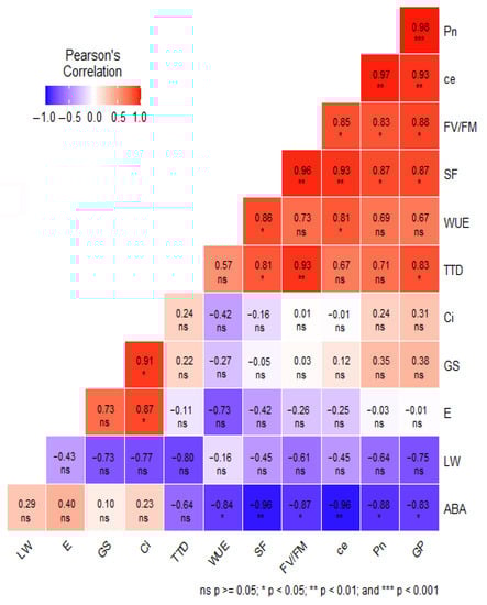 HT stress exposure resulted in a reduction in spikelet fertility, and there was significant (p < 0.001) G × T interaction for spikelet fertility. Among two rice accessions, IRGC 127222 recorded the highest percent reduction (31%) in spikelet fertility over AT-grown plants, while IRGC 135883 showed a lower (21%) reduction in spikelet fertility under heat stress, as compared to AT. The check NL-44 showed a 13% reduction in spikelet fertility due to HT compared to AT (Figure 7a). Similarly, a significant interaction among accessions (p < 0.001), treatment (p < 0.001), as well as G × T (p < 0.001) was observed for grain yield (gplant−1) (Figure 7b). HT exposure decreased the grain yield significantly (58%) in the IRGC 127222 accession, while the reduction in grain yield of IRGC 135883 accession was 11%, and it was at par with NL-44 (9% reduction) under HT treatment. A significant positive correlation was observed between photosynthesis and yield parameters, viz. grain yield (p < 0.001) and spikelet fertility (p < 0.05) and Fv/Fm (<0.05) (Figure 8), while a negative correlation existed between photosynthesis and ABA (<0.05). Similarly, negative correlation was observed between ABA and grain yield (<0.05), SF (0.01) and Fv/Fm (<0.05). However, Fv/Fm showed a positive correlation with TTD (<0.01) (Figure 8).