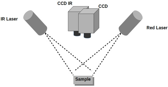 The seeds were placed one by one on a brown paper (Paper Kraft, 80 g m−2) and centred in the field of view of the cameras (Figure 2A). The lasers were switched on 30 min before, and the seeds were illuminated once by the red laser beam, and after horizontal rotation, by the IR laser. During each stage of illumination, 128 images were acquired at 10 frames per second (Figure 1).