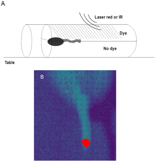 The analysis of the DLS signal, however, gave a different result. Mean AVD values were not affected by the presence of the dye either when the red laser or IR laser were used (Figure 10B). This was expected because the ADV is based on temporal variations of the speckle intensity and its measure is less affected by pixel intensity. However, higher variability of the AVD signal was observed when the red laser was used. This result illustrates how the absorption of the signal reduces the variability of the DLS signal. In the case of the red laser light, absorption is due to the dye and attenuates the intensity of variations in speckle intensity. In the case of IR light, absorption of light is due to water and the variability of the signal is therefore lower than the signal obtained using red light. It is also not affected by the presence of the dye.