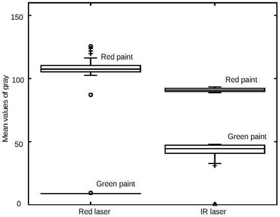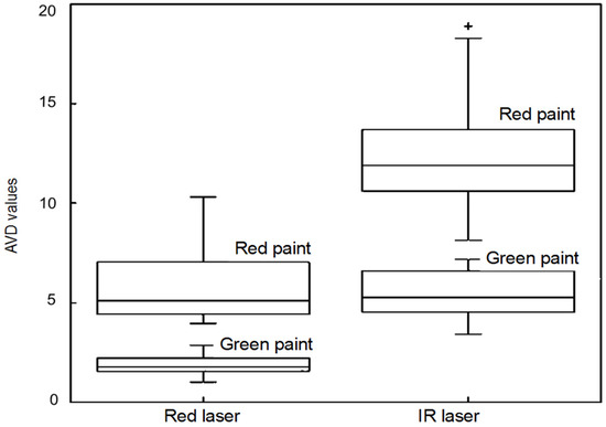 In Figure 5, we can see the AVD values for both types of lasers in both paints (red and green). When the IR laser was used, the activity measured was higher than when using the red laser. Thus, the adoption of the IR laser in DLS measurements, despite the influence of the pigment, presented the ability to return a higher signal to be analysed, resulting in higher values of AVD. In addition, the rates between the AVD values of red and green paints were lower when using the IR laser (i.e., a mean of 2.86 for the red laser and of 2.35 for the IR laser).