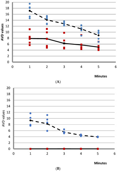 AVD values of the red laser and IR laser over time. (A) Drying of the red paint by red laser (red marks) and by IR laser (blue marks). (B) Drying of the green paint using the red laser (red marks) and using the IR laser (blue marks).