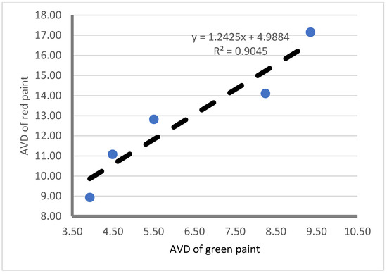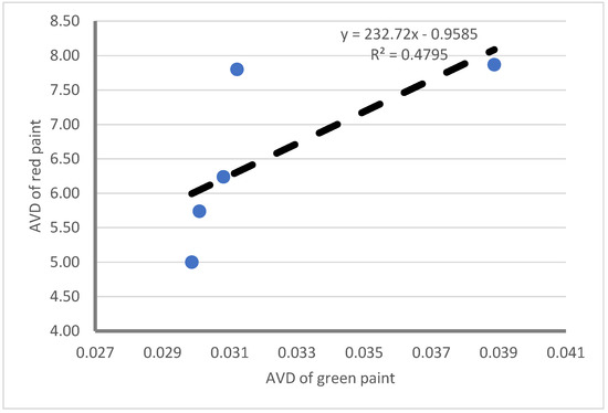 Correlation between AVD values of IR laser illumination of green and red paint.