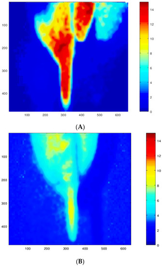 The standard deviation (SD) index was used to produce maps of DLS analysis addressing the activity from maize seedlings (Figure 9). When the DLS signal was captured following illumination with the red laser, higher SD index values were obtained (Figure 9A) with strong variations observed across the sample. The radicle showed consistently high SD values, but the seed itself showed the strongest gradients. By comparison, SD values obtained from the IR laser were more consistent across the entire sample (Figure 9B). The radicle showed high SD values, but the seed showed a more constant SD value, as could be expected.