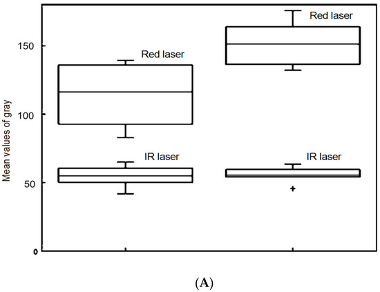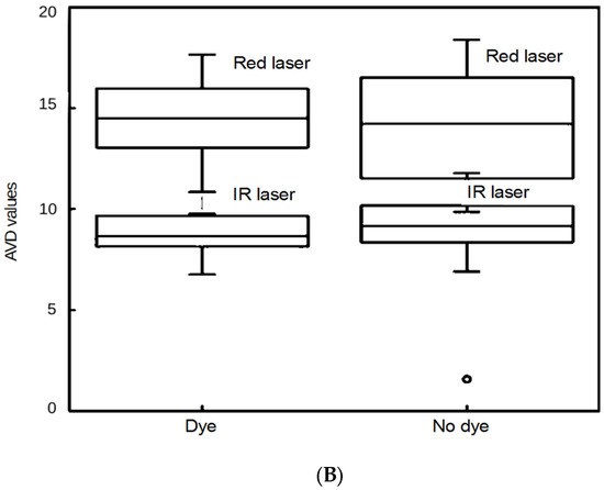 Box plot of (A) mean values of light intensity from the speckle histograms and (B) AVD values from the tip of the root inside dye and no-dye gels in a glass tube illuminated by red and IR lasers.
