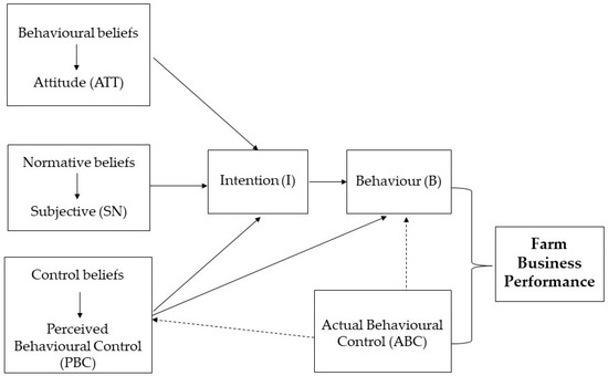 The conceptual link between farmers’ psychological profiles and farm business performance in this study hinges on the theory of planned behaviour (TPB) [10,11] and on the empirical expositions provided in existing studies that focus on the association between farmers’ psychological attributes and farming practices. According to the TPB, three psychological/cognitive elements influence a farmer’s decision to adopt a particular innovative agricultural method to improve farm business performance. These elements include attitude towards the behaviour (ATT), subjective norms (SNs), and perceived behavioural control (PBC). ATT relates to a farmer’s likelihood of possessing a favourable or unfavourable propensity towards a behaviour, SNs are the extent to which farmers’ significant others influence them to adopt a particular innovation, and PBC is associated with the farmers’ perceived difficulty or easiness of adopting an innovation [10,12,13]. Putting the three psychological elements together results in a positive or negative intention to adopt an innovation. Farmers who possess enough actual behavioural control (ABC) will carry out their intention. ABC represents the availability of required behavioural prerequisites such as capital, skills, knowledge, and opportunities. The implication of this is that a farmer’s positive intention may not always lead to adoption of an innovation due to a perception of insufficient ABC (see Figure 1).