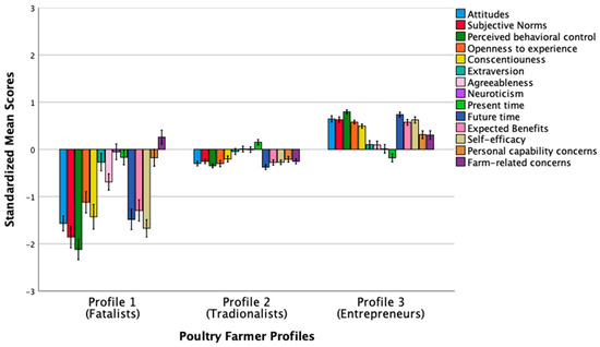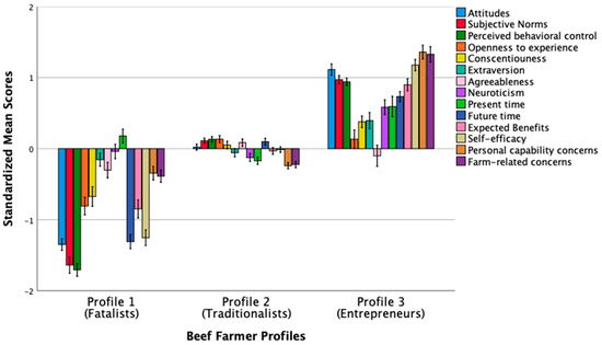 The results of LPA as reported by [9] identified three distinct profiles for both beef and poultry farmers. The psychological features of individual profiles of farmers are depicted in Figure 2 and Figure 3 for beef cattle and poultry farmers, respectively. The horizontal axes of these figures indicate the standardized predicted mean values for each attribute. Most beef cattle farmers (54%) perceived personal capability and farm-related concerns as a deterrent to their business. However, a high proportion of beef cattle farmers (40%) in Profile 3 had positive attitudes and beliefs and a perception of their ability to thrive in their business while showing some concerns about their propensity to work in groups and collaborate.