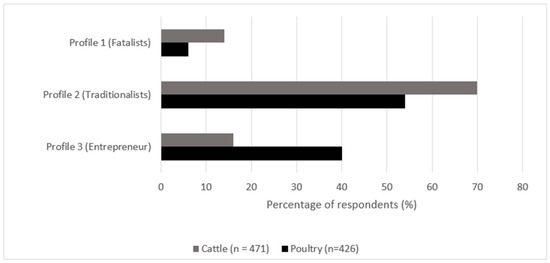 Following the results of [9], the distribution of farmers according to different profiles is shown in Figure 4. The results showed (1) a relatively small proportion of farmers who scored themselves negatively on their ability to control and succeed in their business enterprises (Profile 1, ‘Fatalists’); (2) a group comprising the majority of farmers who were generally neutral about their ability to control and succeed in their businesses (Profile 2, ‘Traditionalists’); and (3) a relatively small group of farmers who were confident of their ability to succeed (Profile 3, ‘Entrepreneurs’).