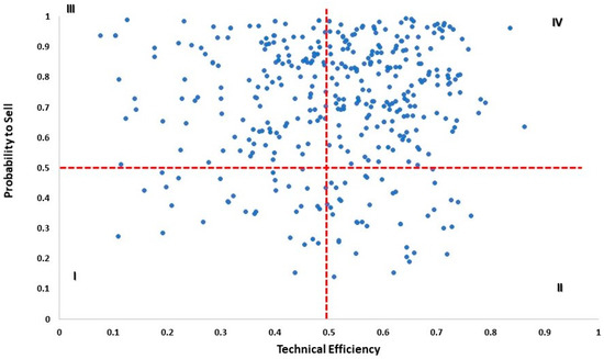 The correlations between technical efficiency scores and predicted probability of selling amongst cattle farmers are presented in Figure 5. The horizontal axis is the estimated technical efficiency, and the vertical axis shows the probability of selling. The distribution of these scores is divided into four quadrants: (I) Low efficiency/low probability to sell; (II) High efficiency/low probability to sell; (III) Low efficiency/high probability to sell; and (IV) High efficiency/high probability to sell. Most farmers (55%) are located in quadrant IV, while 35% are located in quadrant III, and 5% are located in both quadrants II and I.