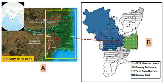 Study area location: (A) highlights the old and new delta regions in the Cauvery delta zone; (B) grid points of future climate data used in the analysis.