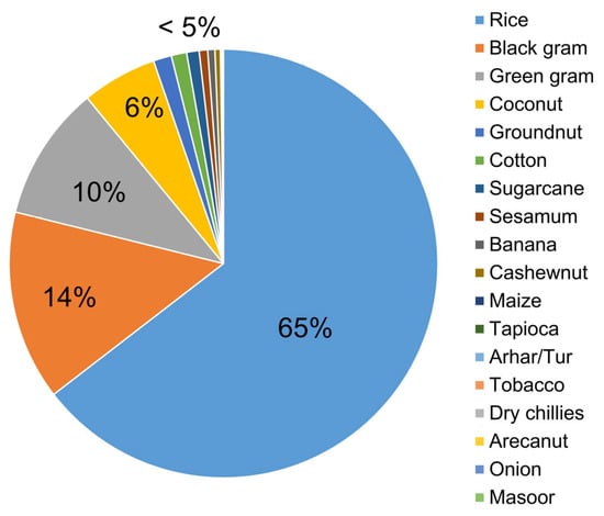 The cropping pattern of Cauvery delta zone, 2018–19. (Source: Directorate of Economics and Statistics, Government of India. “https://aps.dac.gov.in/APY/Index.htm (accessed on 15 June 2021)”.
